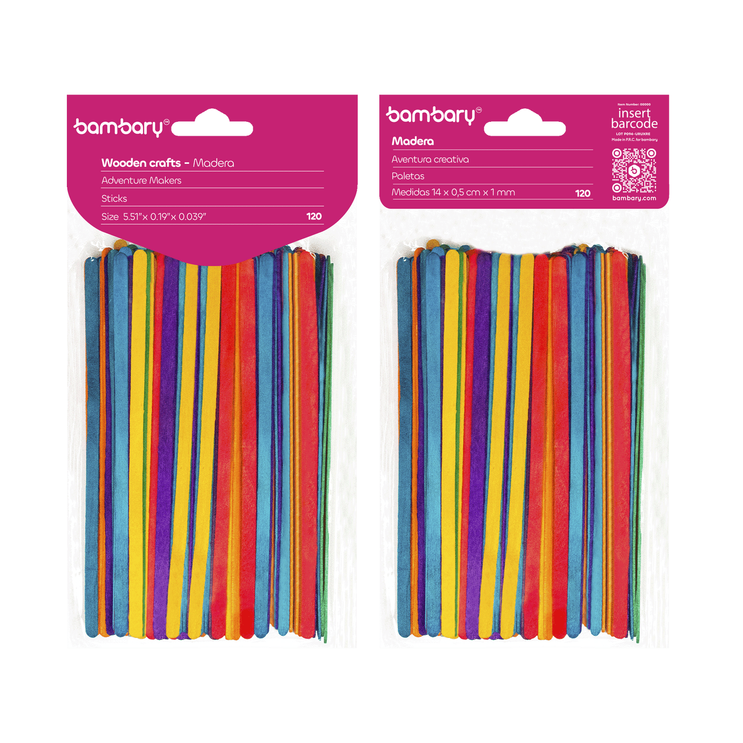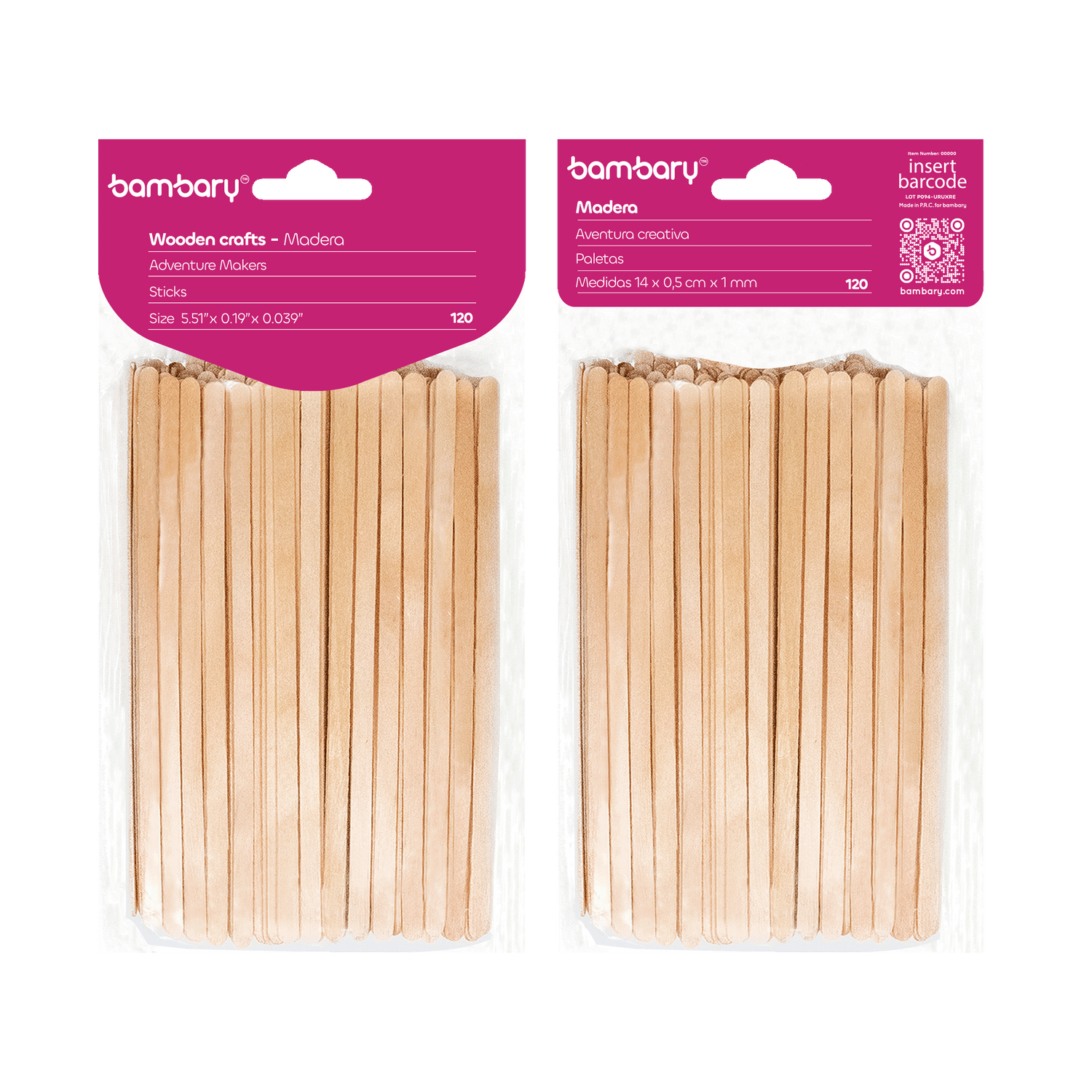 Our Wood Skinny Sticks are perfect for a wide range of crafting projects. This pack includes 120 sticks measuring 140 x 5 x 1 mm, providing you with an ample quantity to fuel your creativity. The sticks are available in two models: natural wood color and multicolor palette, allowing you to choose the style that suits your project best.