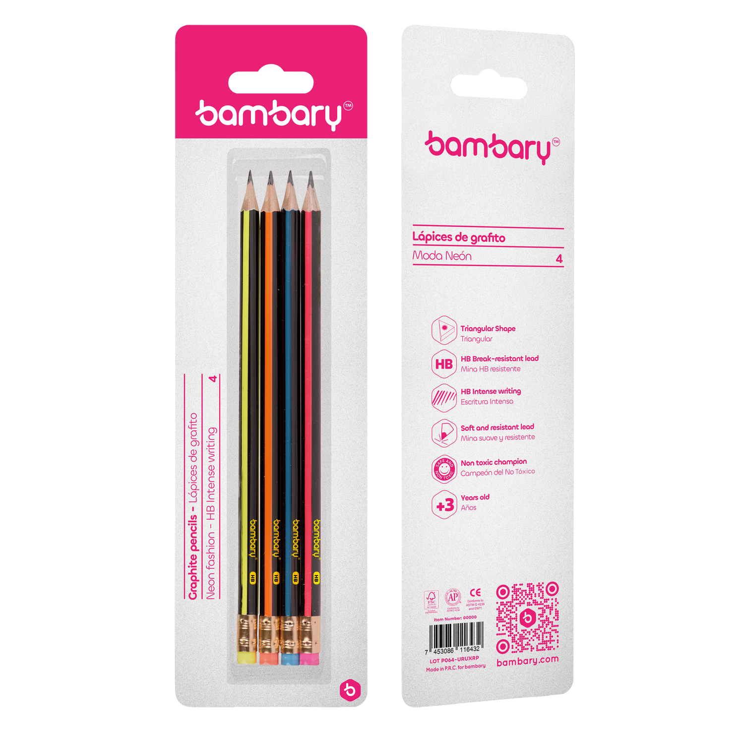 Discover the comfort and style of our graphite pencils. Each pack contains 4 units of triangular-shaped pencils, perfect for easy and comfortable grip. With a size of 7" x 2.20 mm and HB lead, these black pencils with neon stripes will add a touch of fun to your writing and drawing projects.